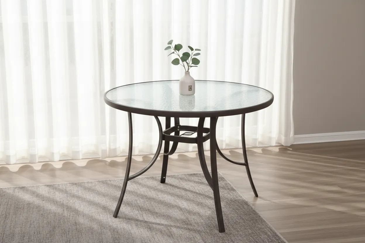 Description: A stylish round outdoor table with a bronze-finished frame and a glass top, designed to bring elegance and practicality to exterior spaces. Its refined look makes it suitable for balconies, terraces, gardens, and outdoor seating arrangements that need a modern and durable table solution.
