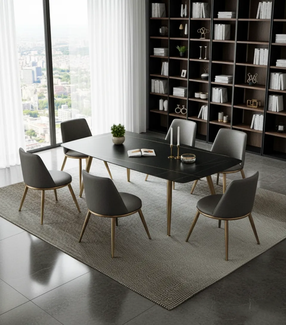 A modern marble-style dining table designed with a black top and elegant gold base. Its bold design and luxurious finish make it a perfect choice for upscale interiors and contemporary dining rooms.